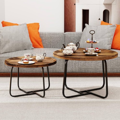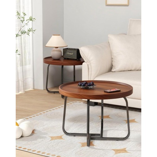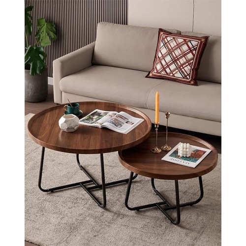 Комплект от 2 кръгли холни масички в скандинавски стил – голяма и малка, които се прибират една под друга за пестене на място. Плот с дървесен декор „орех“ и повдигнат борд (тип поднос) против разливане, стабилна метална основа в черно. Подходящи за хол, дневна или офис; лесни за поддръжка и практични за ежедневно ползване.